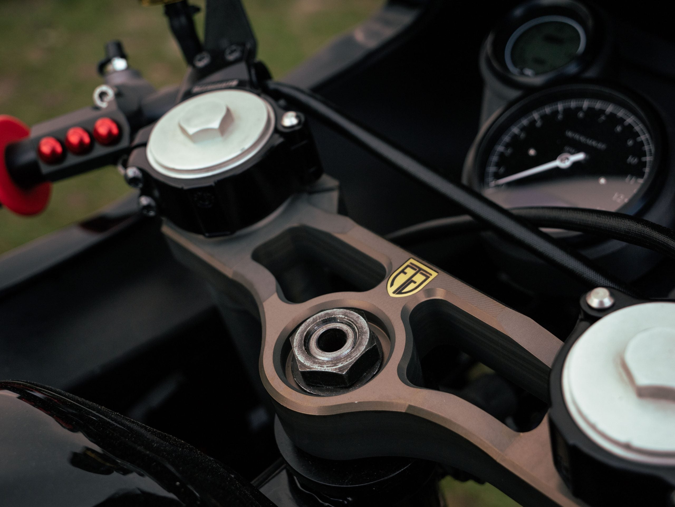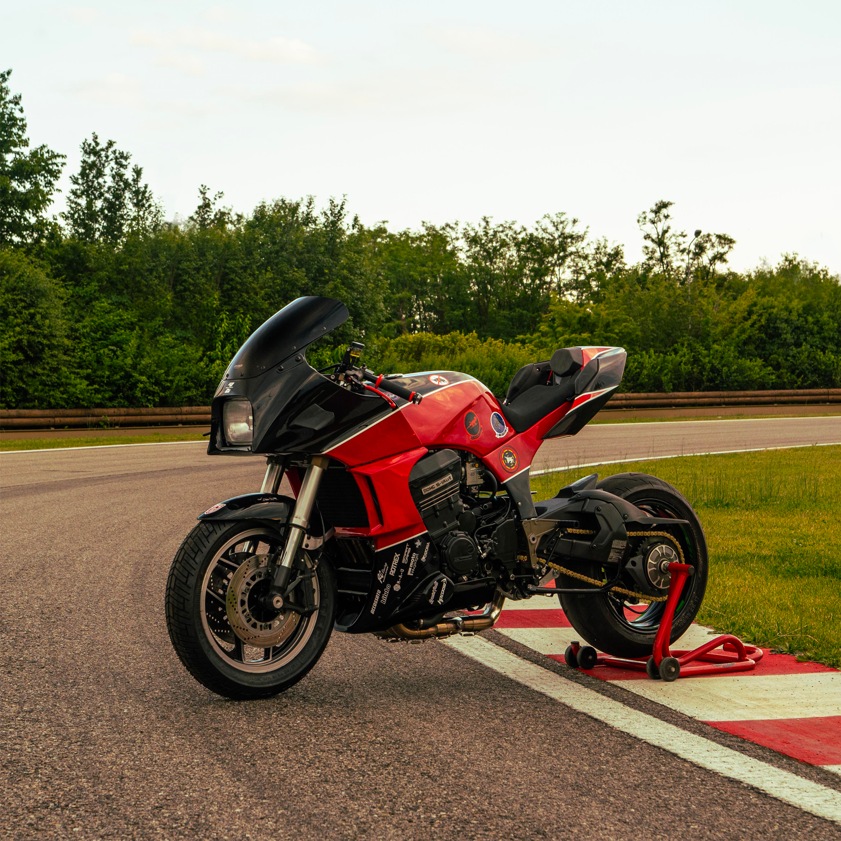 Partendo dalla storia, la parte frontale e la moto di partenza, una Kawasaki GPZ 900 R del 1985, utilizzata nel film Top Gun, per arrivare all’attualità, la parte posteriore e la moto di arrivo, una Kawasaki H2R del 2020, utilizzata nel film Top Gun Maverick.